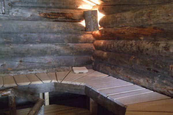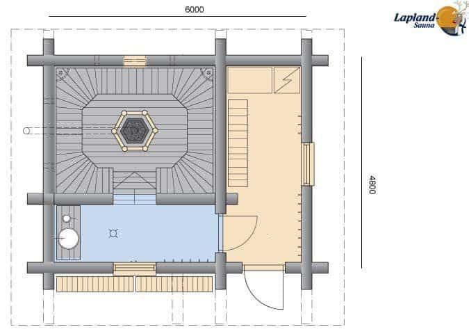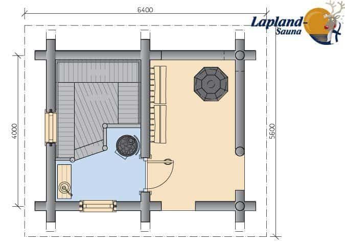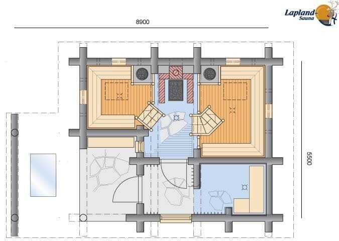 kokoinen sauna, jossa tilava pesutila, pukeutumishuone sekä vilvoitteluterassi.