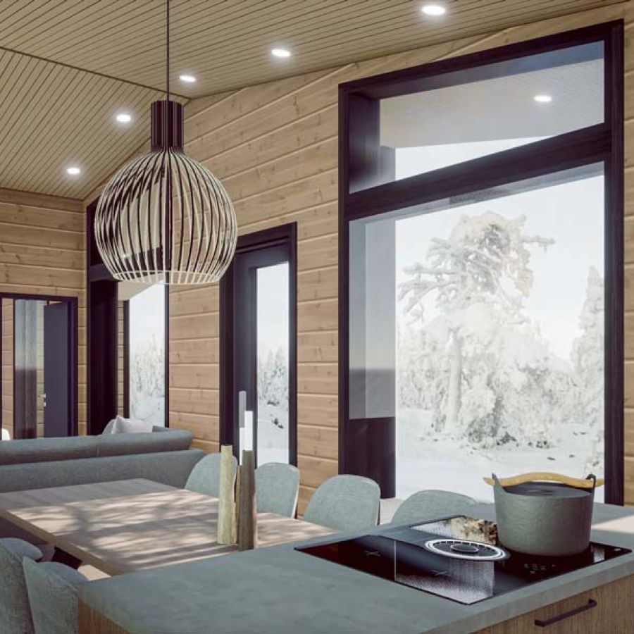 Nämä lomamökit rakennetaan energiatehokkaasta ja ekologisesta ThermiaHirrestä. Lomamökit ovat 100 km2 korkean harjakaton alla. Pohjaratkaisu on suorastaan nerokas, eikä hukkaneliöitä ole. Loma-asunto on suunniteltu nukkumapaikkojen puolesta 8 henkilölle. Olohuoneen ja tupakeittiön korkean katon alla nautit yhdessäolosta, herkullisesta ruuasta sekä takkatulen loimusta. ThermiaHirsi on aidosti energiatehokas ja ekologinen luonnonmateriaaleista valmistettu hirsituote. Ainutlaatuiset ominaisuudet takaavat hengittävän rakenteen ja hyvän sisäilman, sekä energiatehokkaan loma-asunnon pienellä hiilijalanjäljellä.